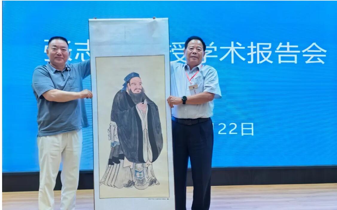 孔令玉會長向儒促會常務(wù)理事兼安徽召集人、天象集團(tuán)董事長孔令發(fā)贈送孔子行教像。
