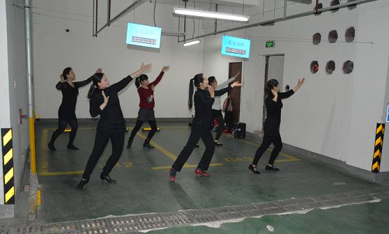鼎盛國際員工在地下車庫認真排練店慶節目