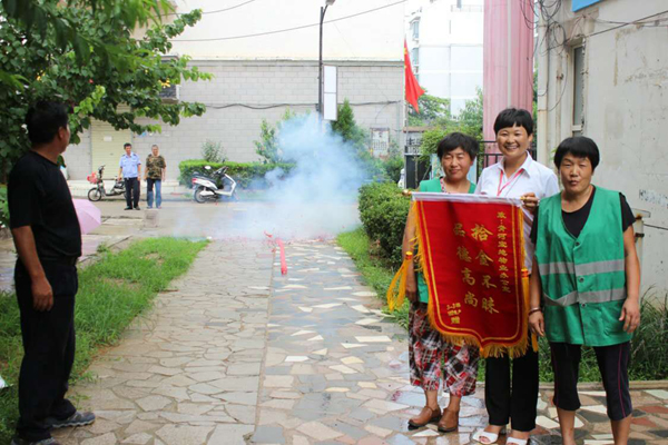 8月2日,淮北天象物業管理公司保潔員祝道俠和任翠萍像往常一樣在清理小區垃圾時,撿到一個皮包,打開一看里面裝有一萬多元,她們意識到這包應該是業主不小心遺失的,于是趕緊向物業公司領導匯報,希望可以及時聯系上業主。物業公司立即通過走訪詢問找到了失主,失主喜極于泣,感激萬分!事后,業主將一面寫有“拾金不昧,品德高尚”八個大字的錦旗、水和糖送到了小區物業管理處,還燃放了兩掛鞭炮,對祝道俠和任翠萍兩名同志拾金不昧的義舉表示感謝。